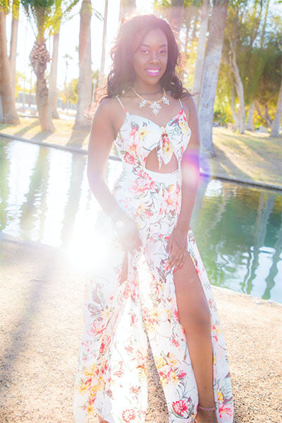 Floral print jumpsuit with adjustable straps, long front leg slits, panty lining, and back zipper