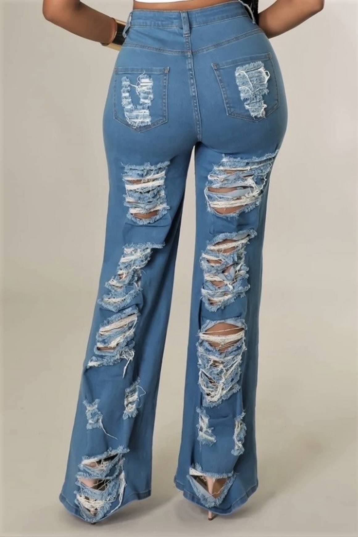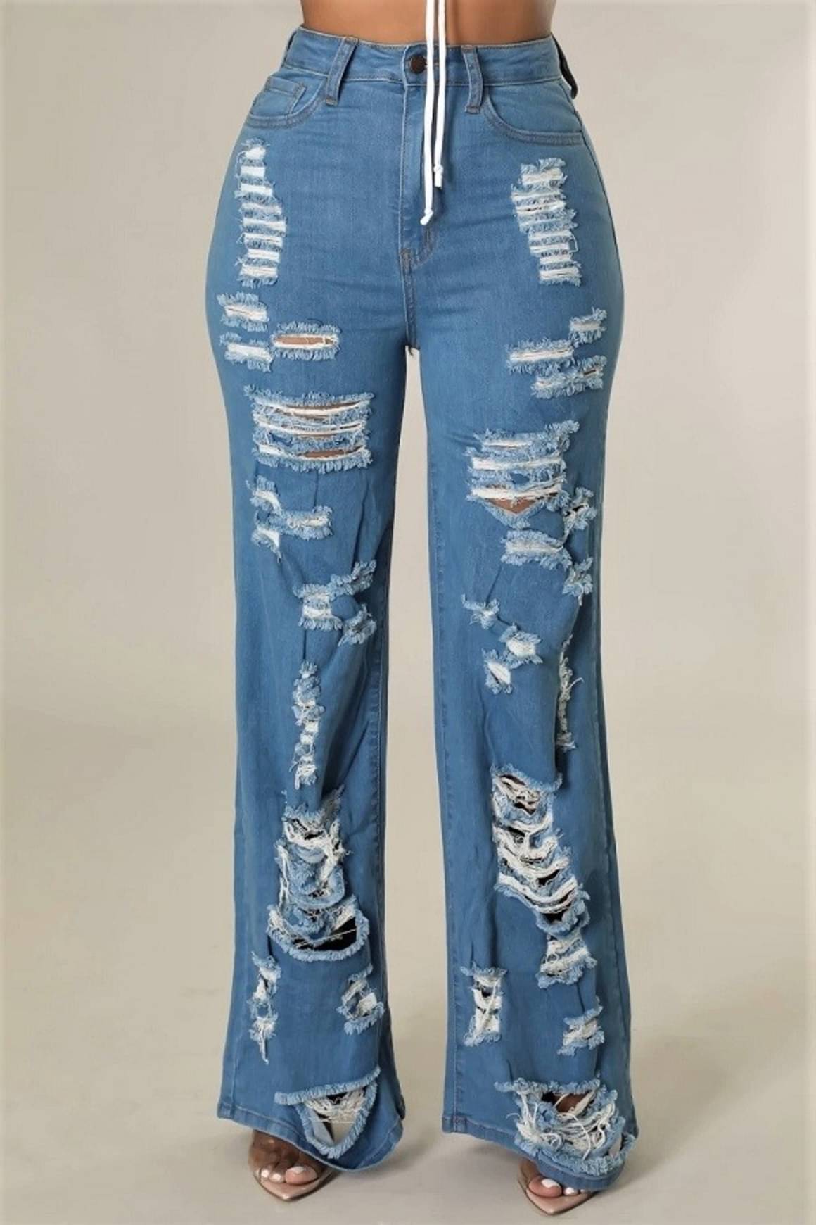 High rise medium blue denim wide leg flare jeans with front and back heavy destruction